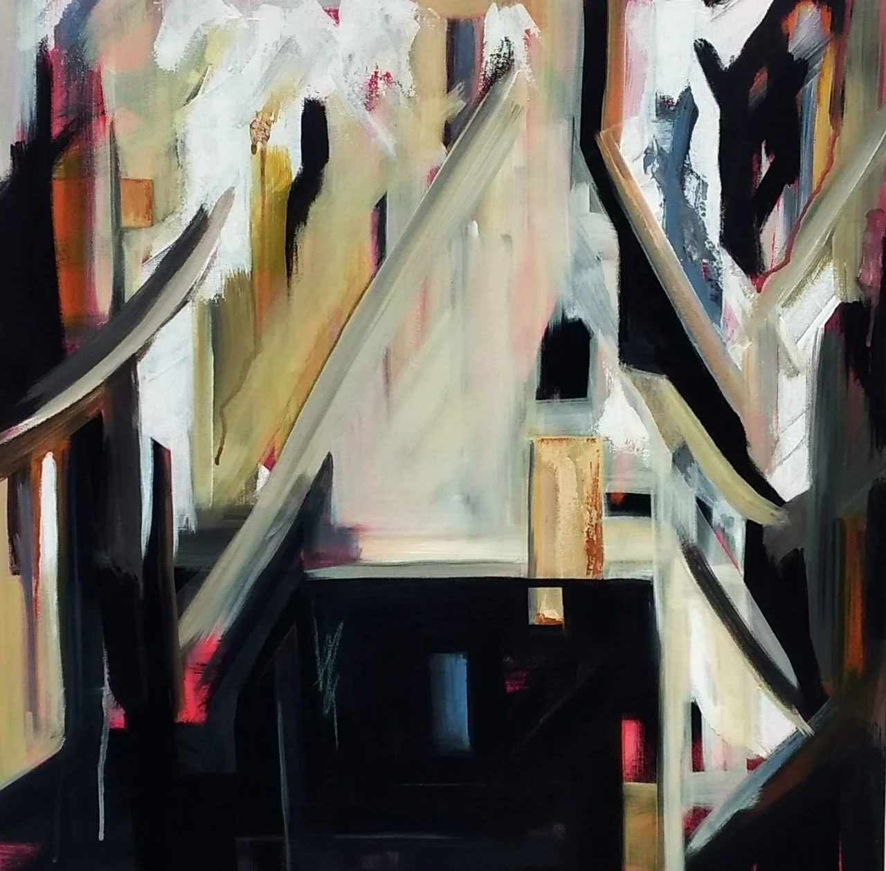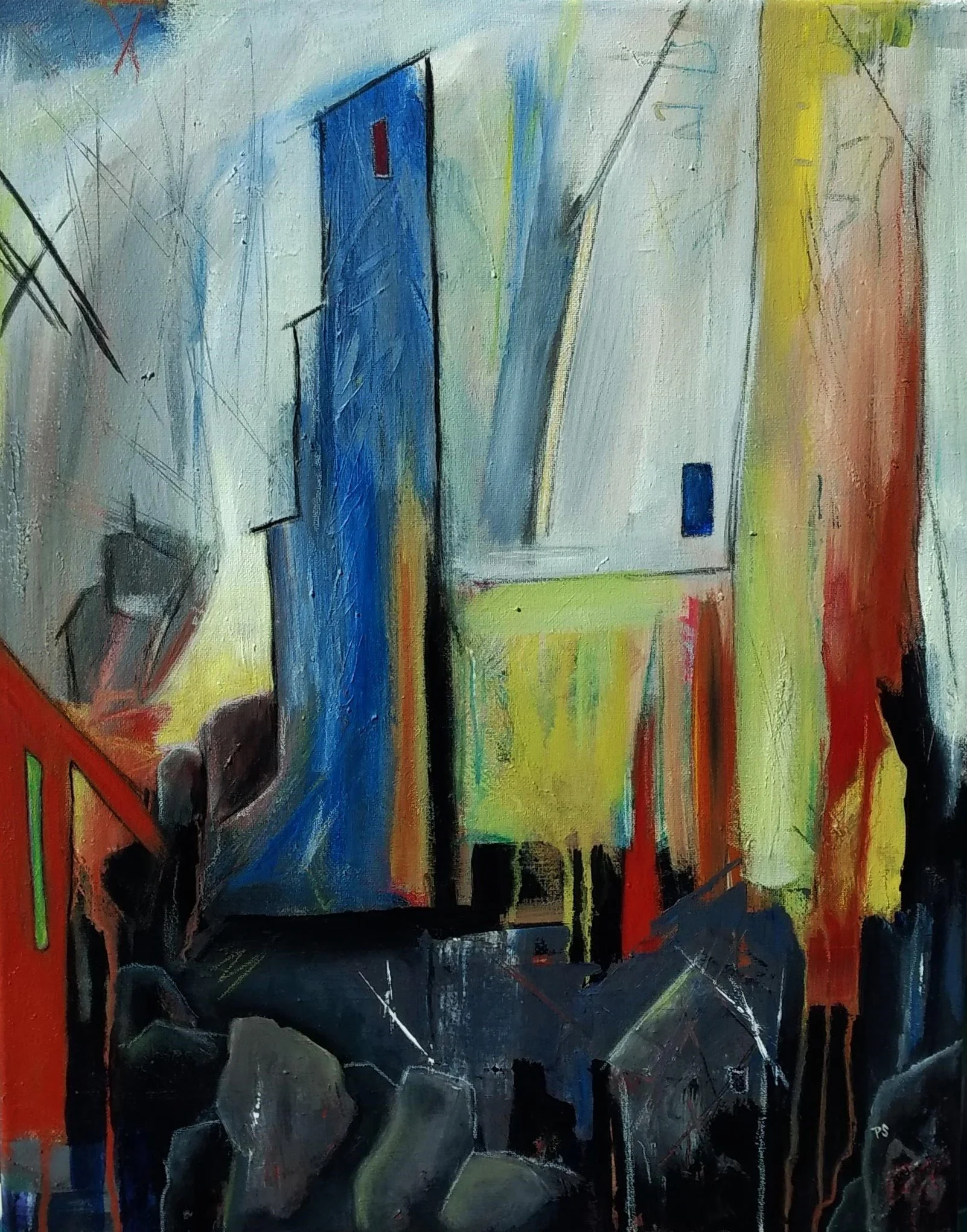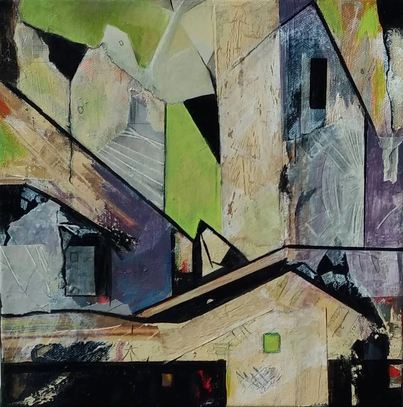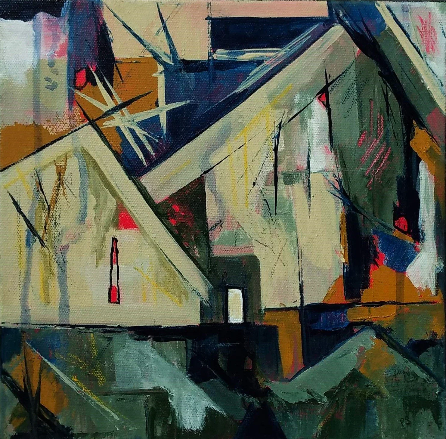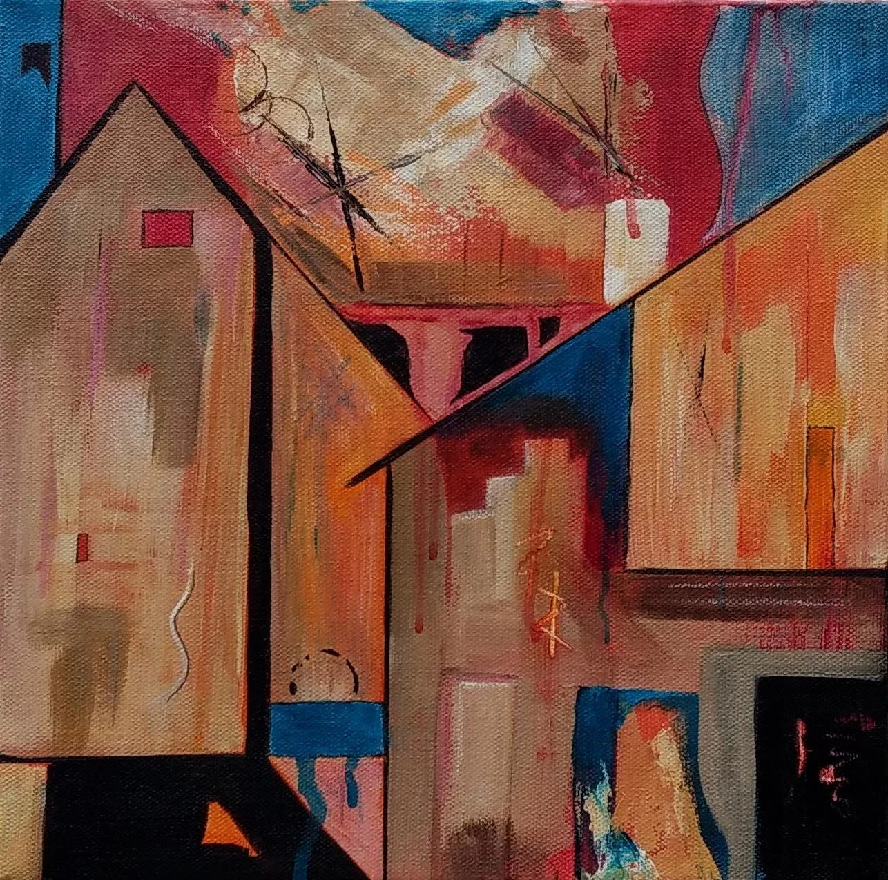 I paint intuitively, allowing my work to develop on an emotional level. Shapes resembling houses started appearing in my paintings, leading to this body of work.